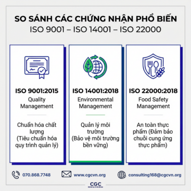 So sánh các chứng nhận phổ biến: ISO 9001 – ISO 14001 – ISO 22000