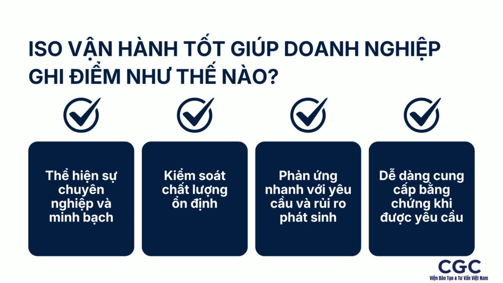 Ngược lại, khi ISO được triển khai và vận hành đúng cách, doanh nghiệp sẽ có lợi thế rõ rệt trong mắt khách hàng quốc tế. Hệ thống ISO giúp doanh nghiệp:
